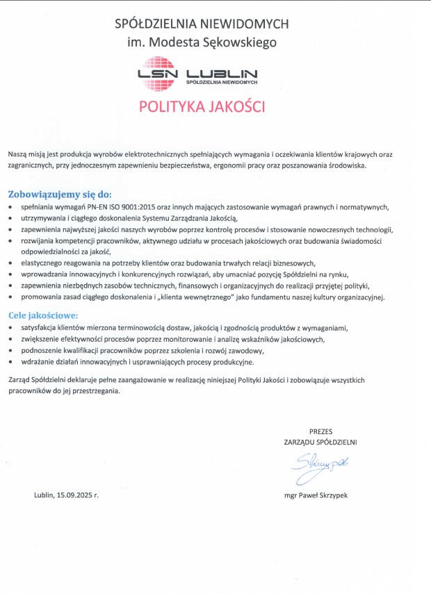 Za jakość Naszych wyrobów odpowiada wewnętrzna polityka oparta na systemie zarządzania jakością ISO. Certyfikację ISO 9001 LSN posiada od 2000 roku. Nasza firma stawia na ciągły rozwój poprzez rozbudowę parku maszynowego, automatyzowanie stanowisk kontrolnych oraz stałe szkolenia pracowników podnoszące ich kwalifikacje.